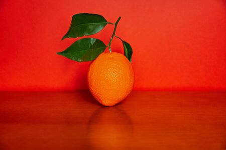 Orange with green leafs at red background and wooden foreground