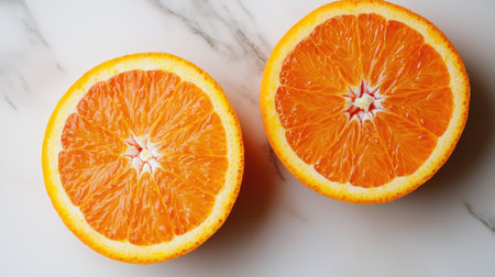Showcasing two halves of a fresh orange on a stylish marble surface, this image emphasizes the vibrant color and juicy texture, perfect for food-related projects.