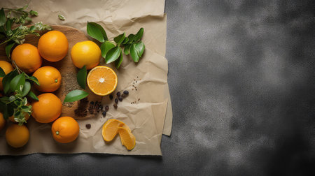 Sliced oranges with leaves and flowers on grey textured background