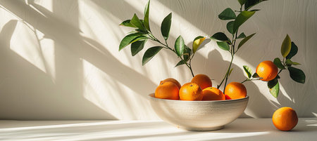 Minimalist kitchen white quartz countertop, potted plant, and oranges, perfect for text placement