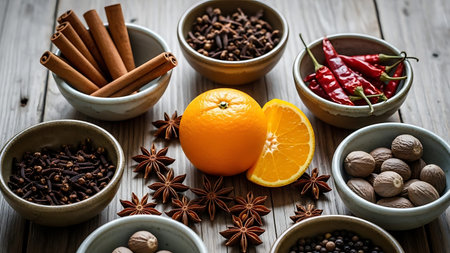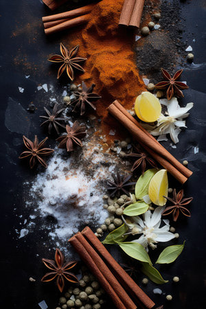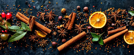 An overhead shot reveals a colorful assortment of spices and herbs. Cinnamon sticks, star anise, and peppercorns are scattered among vibrant powders and citrus slices. The composition features a dark background, highlighting the textures and natural elements. This image is suitable for culinary, health, and wellness-related publications.
