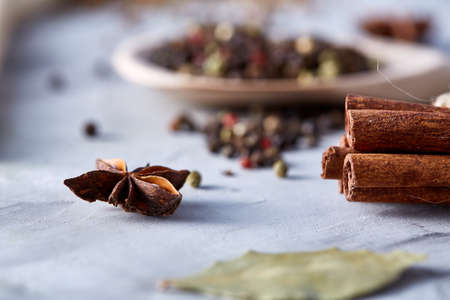 Dessert spices and wooden spoon on white textured background, close-up, shallow depth of field, selective focus, front focus. Anise star, bay leaf, cinnamon sticks and peppercorns as aromatic ingredient of meditteranian cuisine. Food concept.
