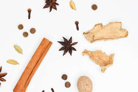 Ginger wedges. Cinnamon sticks, cardamom and cloves on white background. Flat lay. Copy space