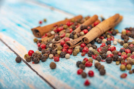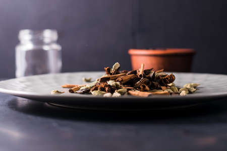 Garam masala, mix of different spices black and white peppercorns, cloves, cinnamon, mace, cardamom, cumin. Indian blend of ground spices in wooden box .Close up