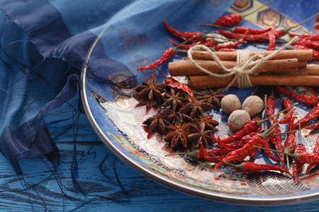 Exotic spices and chilli pepper flying on. Hot spices concept.