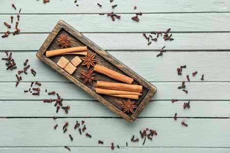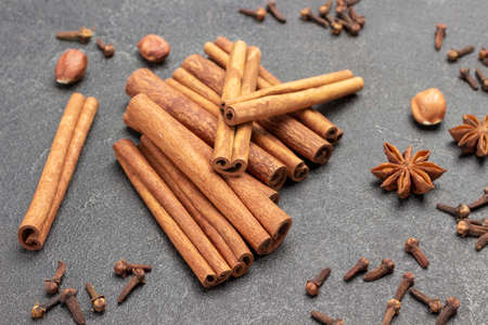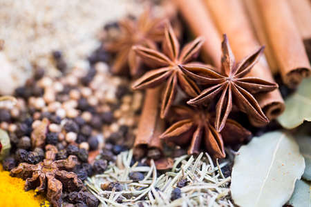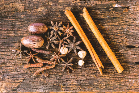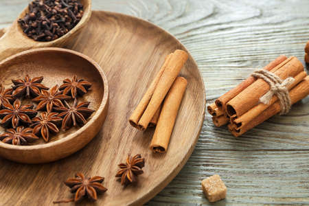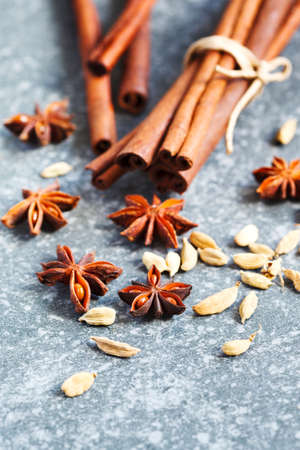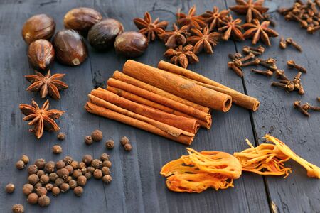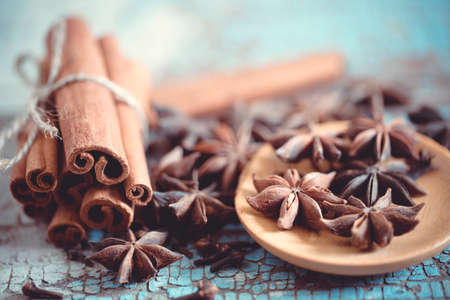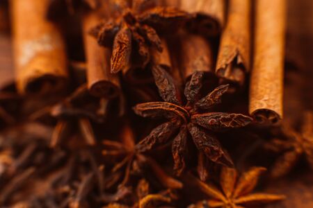Close up of anise stars, carnation and cinnamon sticks on wooden background