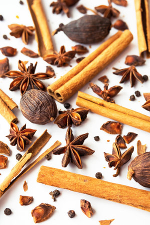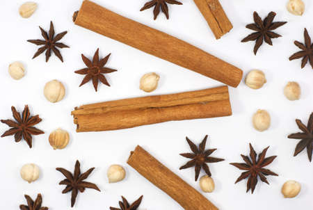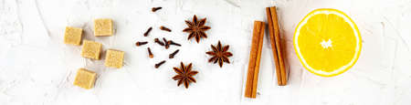 border of spice on white background. Ingredients for a mulled wine. Cinnamon, anise stars, orange, brown sugar, cloves. Christmas hot drink