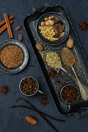 Food concept mix of masala spices, cinnamon, fennel, star anise, coriander seed and cinnamon pods in copper cup on black slate board
