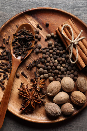 Brown spices on wooden background. Cinnamon sticks, nutmeg, cloves, allspice, star anise.