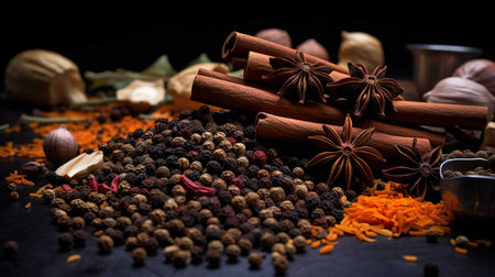 close-up of cinnamon, nutmeg, and autumn spices, created with generative ai