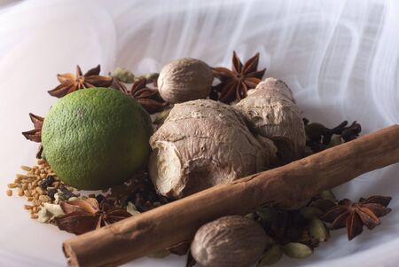 closeup of Ayurvedic ingredients, a lime with whole spices in smoky white glass bowl