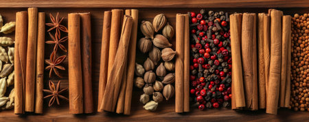 A vibrant display of whole spices, such as cinnamon sticks, star anise, and cardamom pods, arranged on a wooden platter. The rich textures and colors of the spices create an inviting and aromatic scene, perfect for a culinary setting.