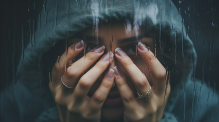 Close up of young woman with depression and bulimia sitting alone in gray room. She covers her face with hands. Mental problems with depression and bulimia.