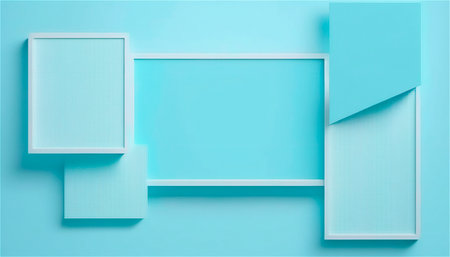 An artistic arrangement of white picture frames set against a light background. This minimalistic composition evokes creativity and is ideal for artistic projects.