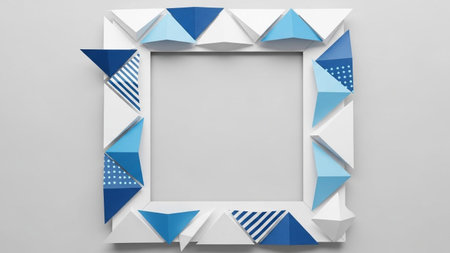 A square frame is intricately decorated with a border of folded paper geometric shapes. Predominantly white, the shapes are accented with various shades of blue and feature patterns like stripes and polka dots. The triangles and other folded forms create a dimensional and visually engaging surface. The arrangement is symmetrical, giving the frame a modern and artistic aesthetic. This handcrafted piece serves as a unique decorative showcasing photographs or as a standalone piece of wall