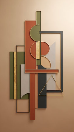 Edges showing abstract geometric composition with terracotta olive gold and gray shapes and golden edges. resolution use.