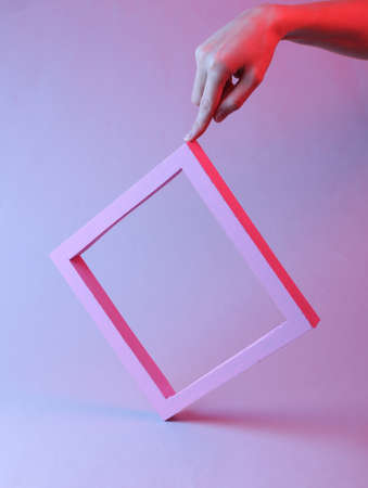 Hand holds frame in red-blue neon light. Concept art, minimalism