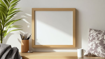 Frame mockup with plant pot, mug and apple on wooden shelf. Empty frame mock up for presentation design. Template framing for modern art.