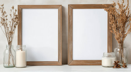 Two rustic wooden frames stand side by side on a minimalistic surface. Dried flowers in glass vases and a candle enhance the serene ambiance, complementing the soft wall texture.