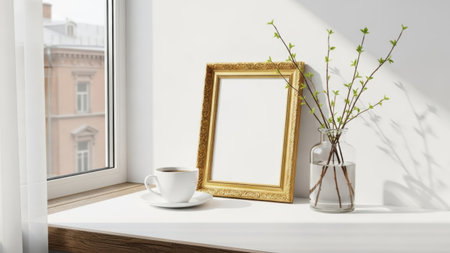 Black frame leaning on white shelf in bright interior with plants and decorations mockup 3D rendering