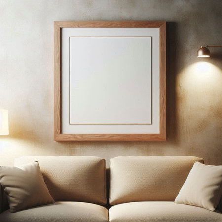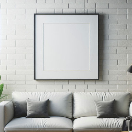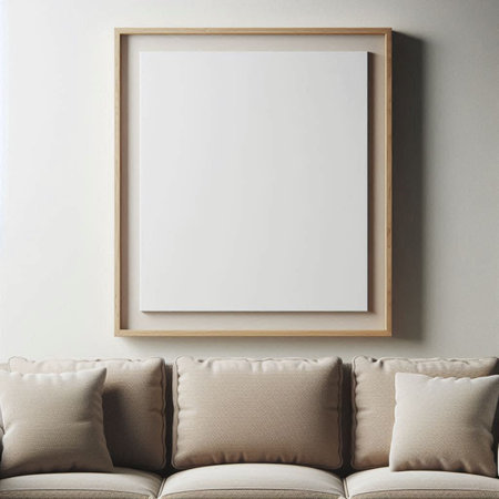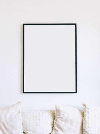 Mock up poster frame in living room interior, minimalistic style, 3d render