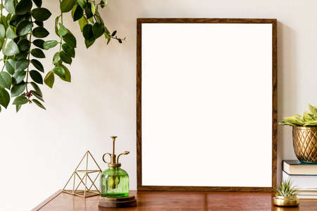 Stylish and retro space of home interior with mock up poster frame, vintage cupboard with elegant gold accessories, airplants, plants and books. Cool home decor. Minimalistic concept. Template.