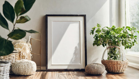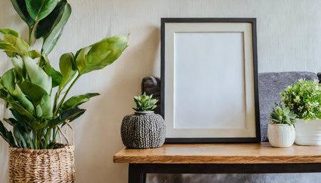 Mock up photo frame, elegant accessories and beautiful plants in different pots.