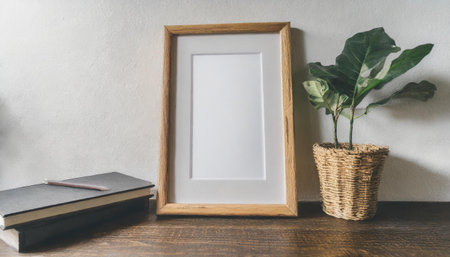 Photo frame mockup on white brick wall with wooden table, book. Picture vertical frame mock up template with beige color.