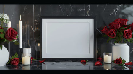 Mock up blank frame with red roses on black marble countertop. 3d render