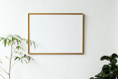 Modern panel with plant in an office room. Minimalist black frame mockup on white background for the design of advertisements. Square frame against a wall.
