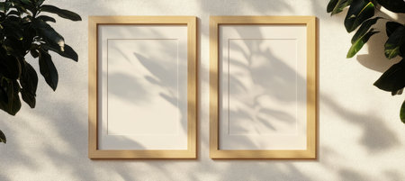Two Vertical Wooden Picture Frames Mockup With Sunlight And Plant Leaves Shadows On Empty White Wall