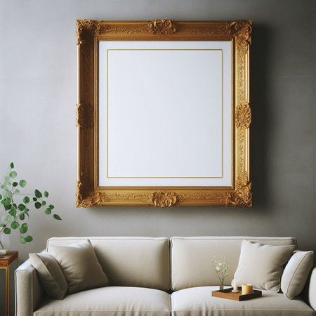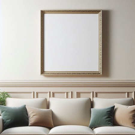 Interior of modern living room with beige sofa and golden frame mockup, 3d render