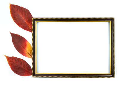 Minimal concept. Dry leaves on a white backdrop with a picture frame.