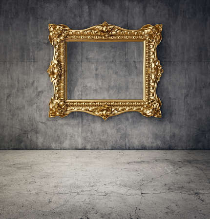 Blank gold frame isolated on grey background. Empty museum mockup