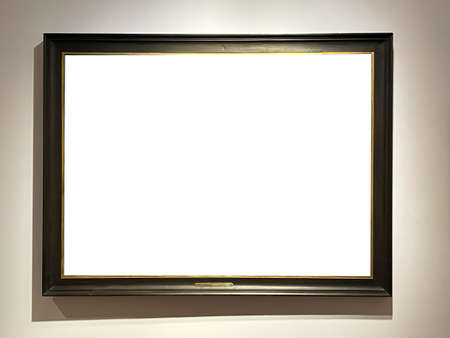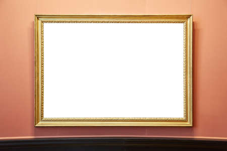 Antique wooden art fair gallery frame on the wall at auction house or museum exhibition, blank template with empty white copyspace for mockup design, artwork concept