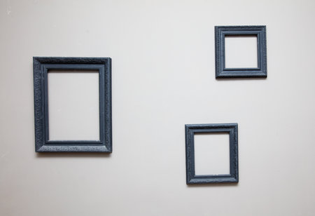 Three black framed pictures are hanging on a white wall. The frames are square and the pictures are empty