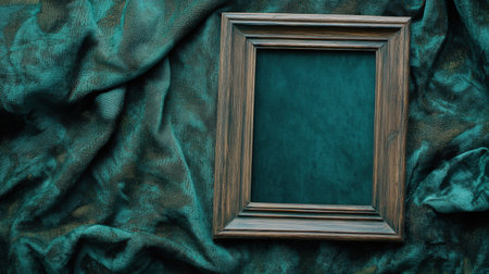 A vintage wooden frame sits elegantly on soft teal fabric, creating a perfect backdrop for art display or photography projects, conveying style and warmth.