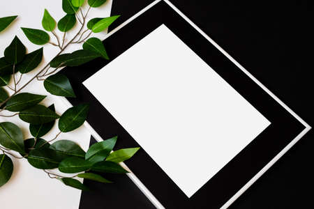 White picture frame with decorations. Mock up for your photo or text. Place your work, print art, white background, pastel color book. Photo realistic 3d illustration. Black and white background