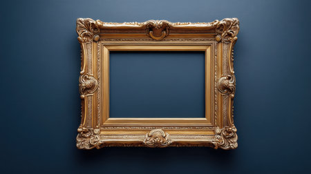 This ornate golden picture frame features intricate details and an elegant design, perfect for showcasing artwork or photography on a contrasting dark background.