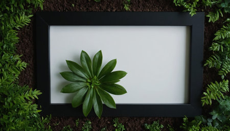 Blank horizontal black frame beside a houseplant, painting or artwork display on brown knitted cloth