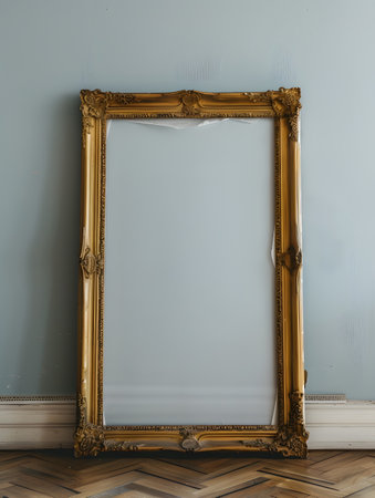 A rectangular gold picture frame rests on a hardwood floor against a wall