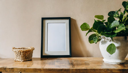 Blank picture frame mockup on the wooden table with plant in vase