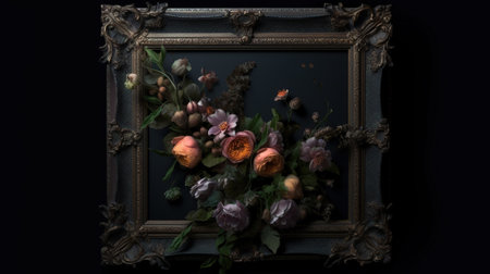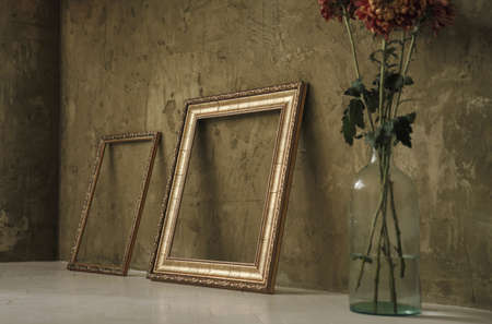 old wide golden ornamental picture frame with cutout canvas on gray brown wall