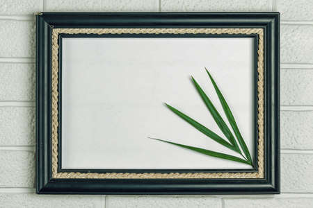Green branch of a palm tree in an old frame in blue on a background of a white brick wall. Copy space.