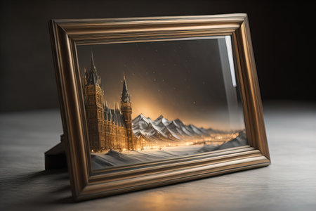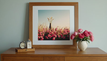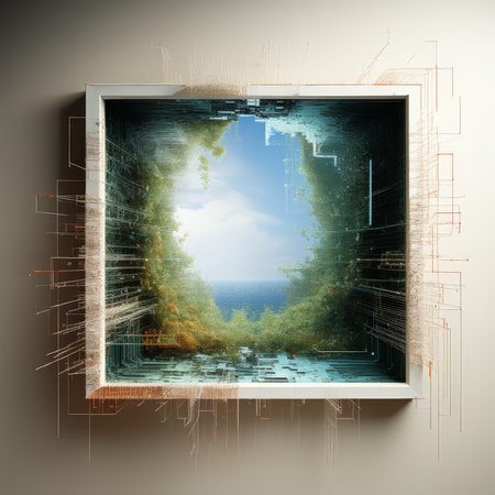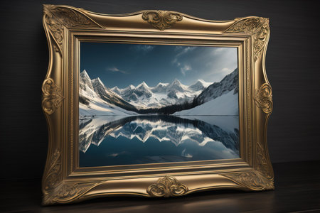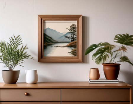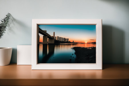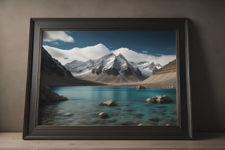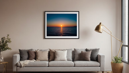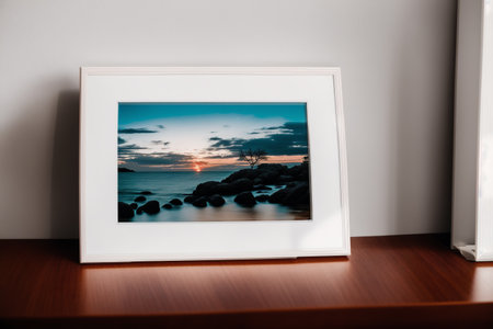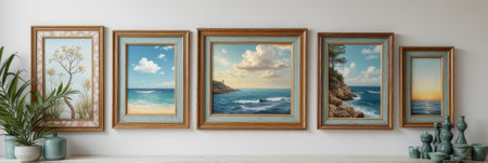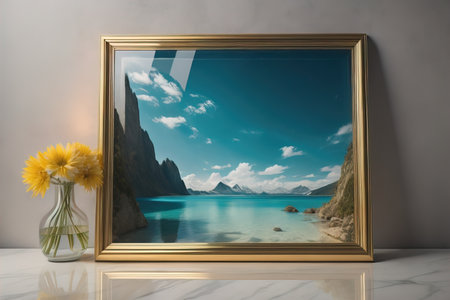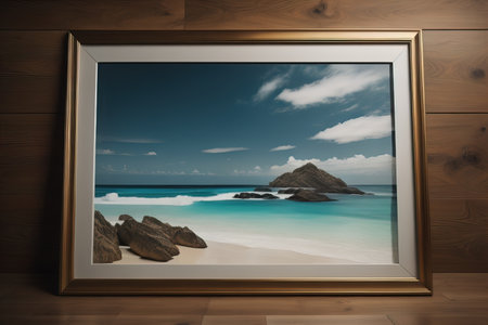 Framed seascape art display with ocean and sky themes. That the image is generated using AI.