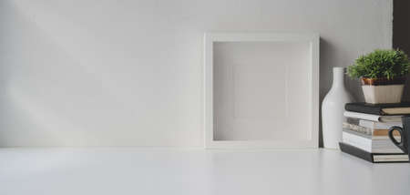 Minimal workspace with mock up frame and copy space, white desk and white wall background