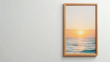A framed print of a serene ocean sunset, featuring a bright sun, soft clouds, and gentle waves, all within a light wood frame.