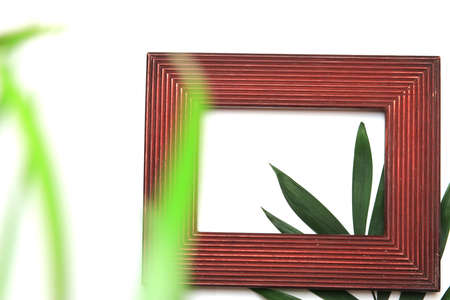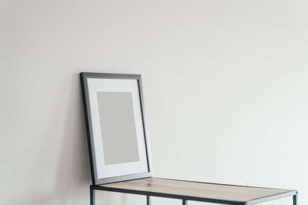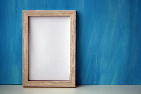 Blank wooden photo frame stands in the interior on a white background. Mockup poster frame.