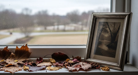 Autumn still life with dry leaves on the windowsill and a picture frame