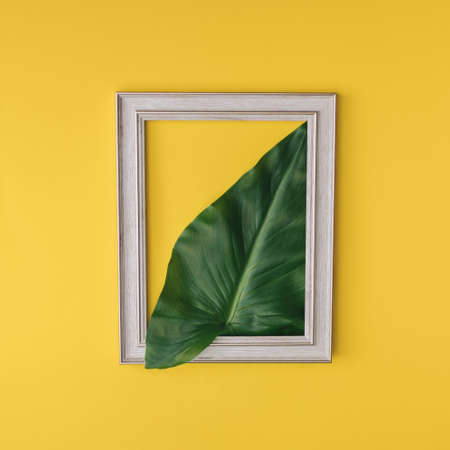 tropical nature green palm leaf in picture frame on white background with blurred tree